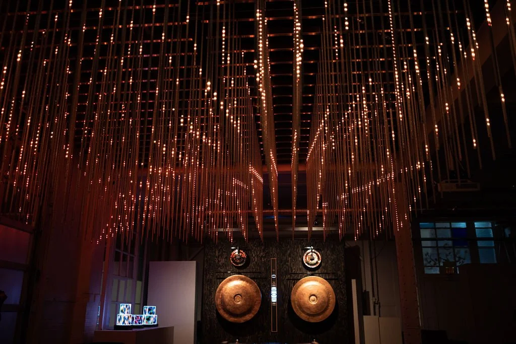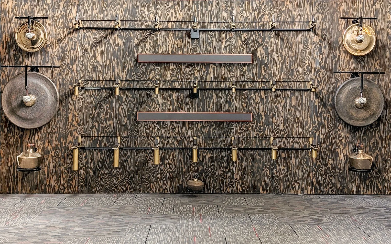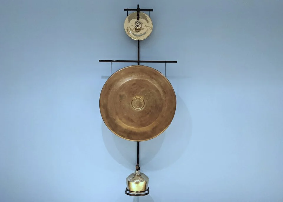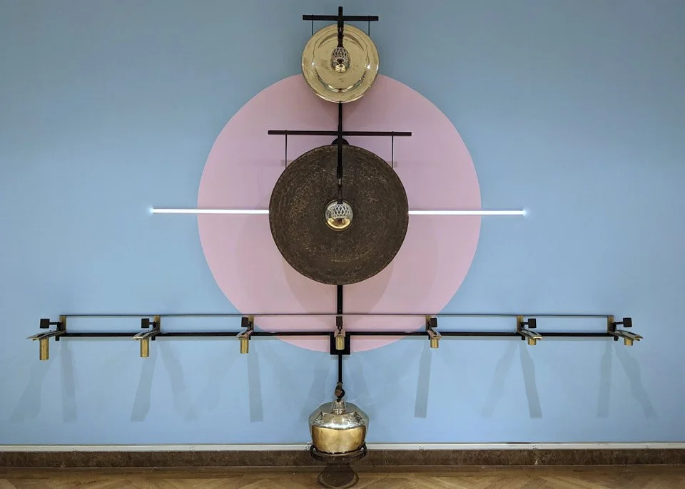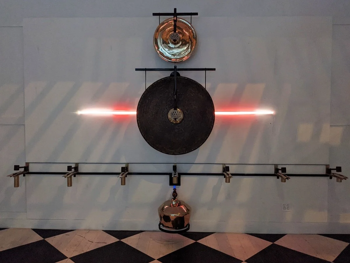 Description: Gamelatron Roh Ageng is a sonic kinetic sculpture made by Aaron Taylor Kuffner. It is comprised of Javanese royal court gamelan instruments tuned in Slendro. This set features 4 Hanging Gongs between 85 and 100cm, 5 Kempul (mid-sizd gongs), 5 Kenong (large kettel gongs), Ketuk, and Three 7-key metalaphones: Demung, Saron, and peking. Each are retrofitted with electromagnet mallet mechanism triggered by a physical computing system, mounted on powder coated steel mounting sculptures.