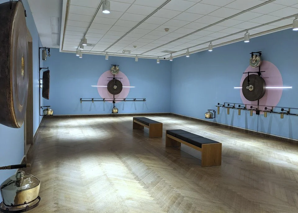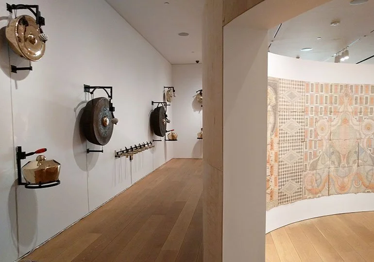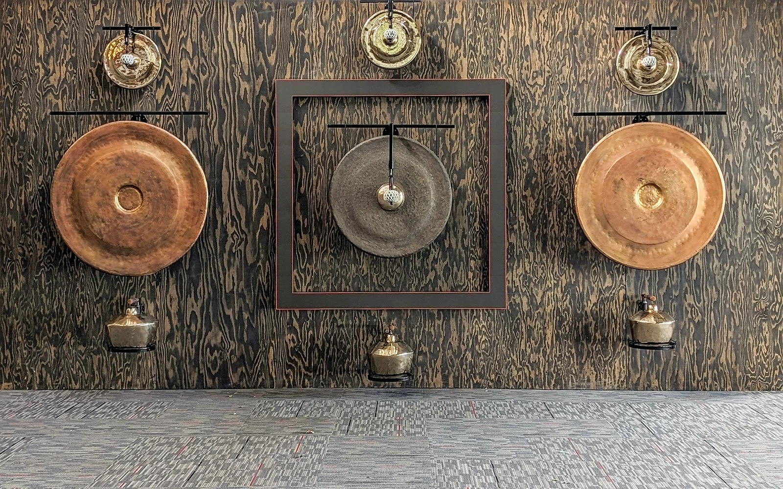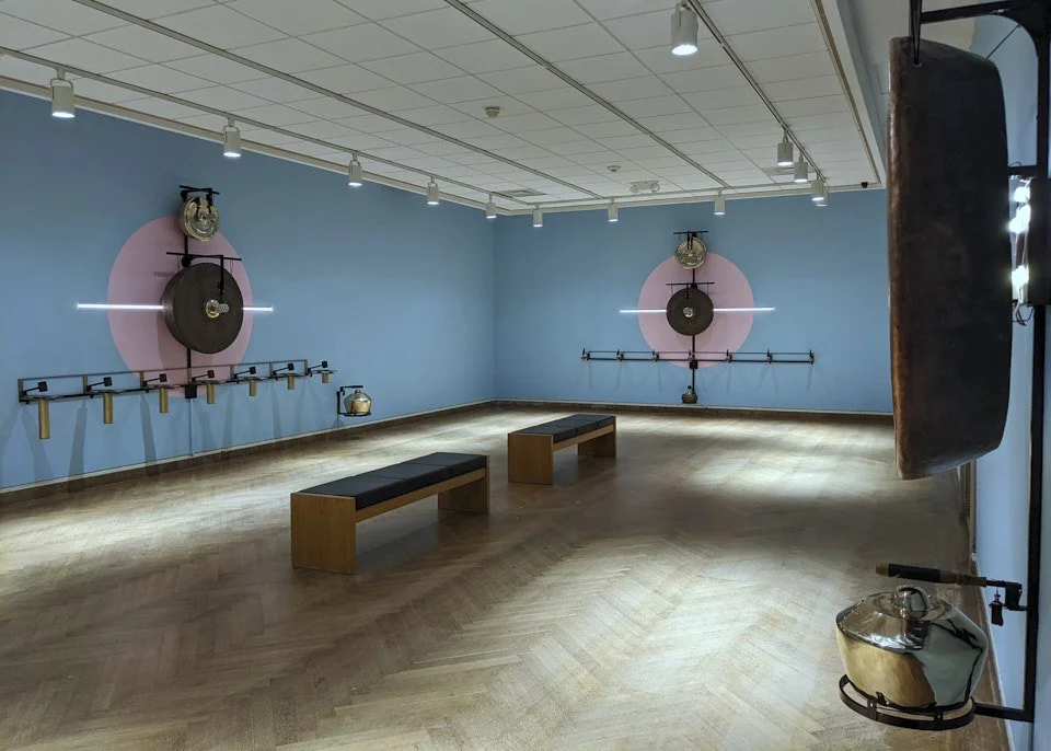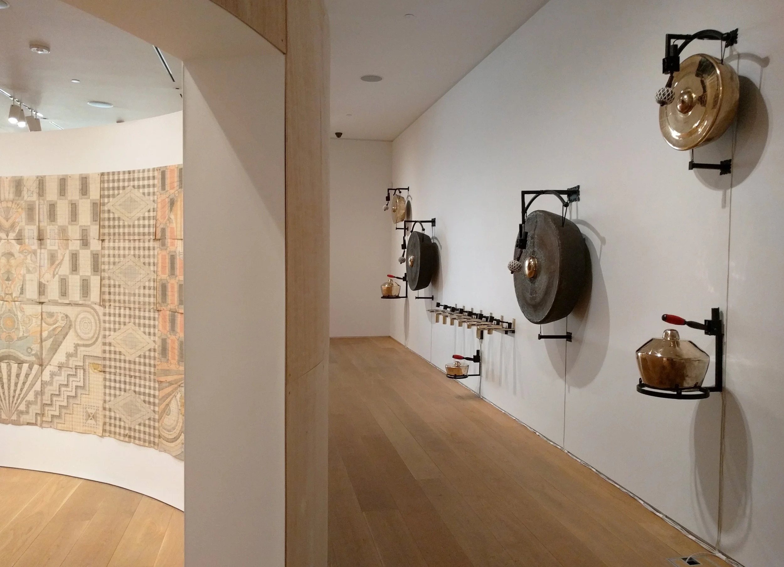 Description: Gamelatron Roh Ageng is a sonic kinetic sculpture made by Aaron Taylor Kuffner. It is comprised of Javanese royal court gamelan instruments tuned in Slendro. This set features 4 Hanging Gongs between 85 and 100cm, 5 Kempul (mid-sizd gongs), 5 Kenong (large kettel gongs), Ketuk, and Three 7-key metalaphones: Demung, Saron, and peking. Each are retrofitted with electromagnet mallet mechanism triggered by a physical computing system, mounted on powder coated steel mounting sculptures.