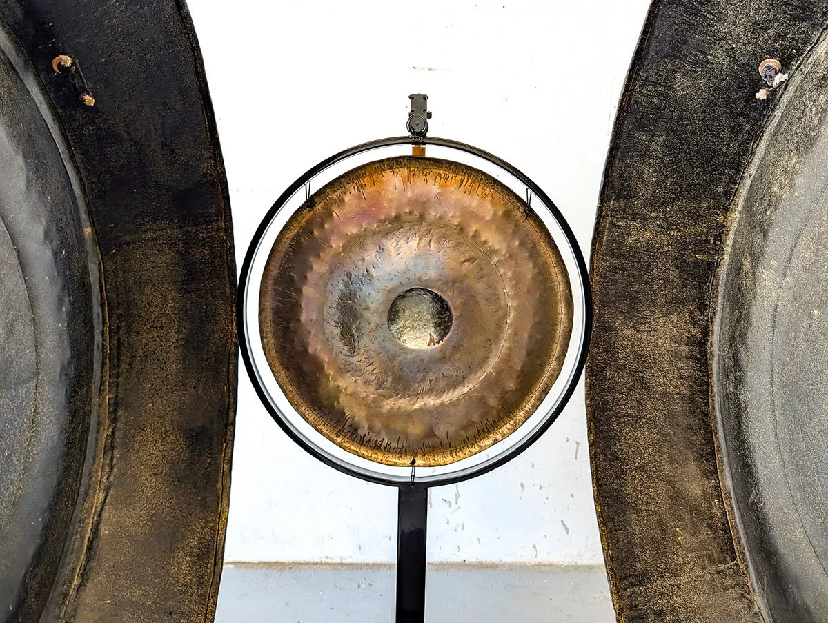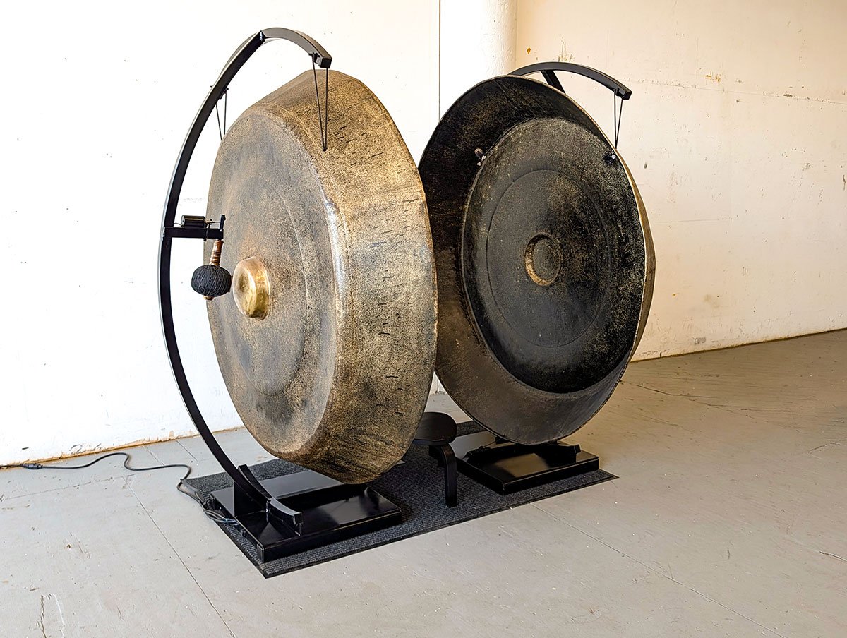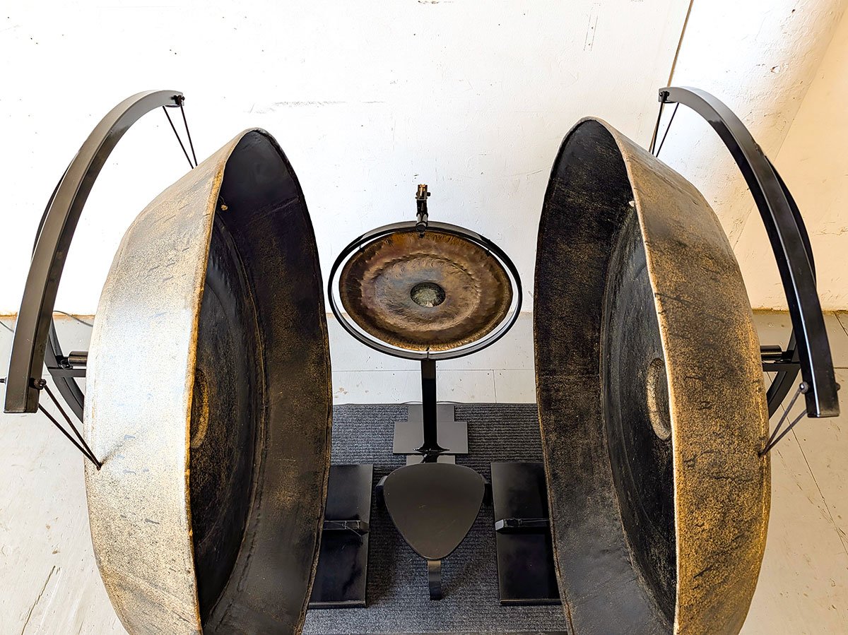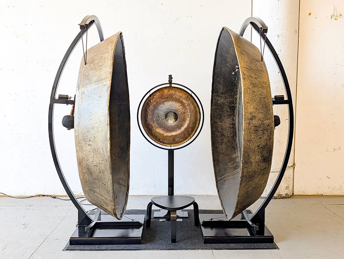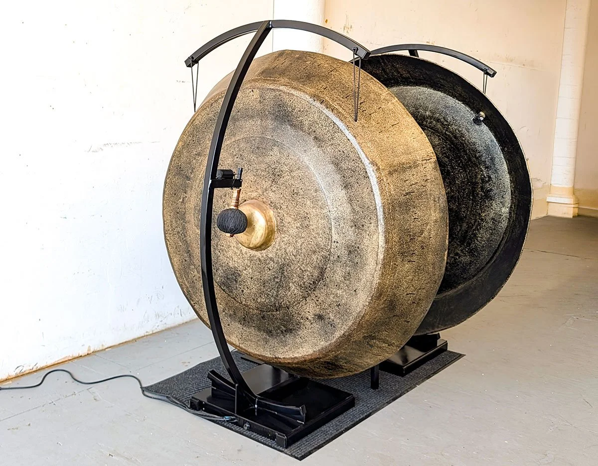 Description: BodyPhones consists of two 5ft (152cm) steel and brass gongs that resonate around 36 Hz and a 22 inch (56cm) patinated titanium gong on powder coated steel freestanding mounts with aluminum, wood, bicycle tire and fabric robotic gong mallet mechanisms connected to a physical computing system.