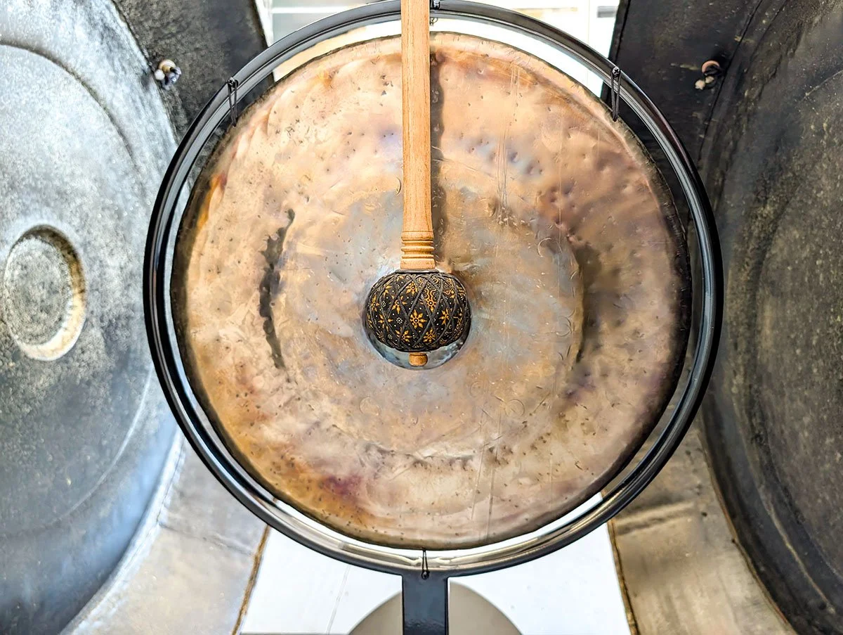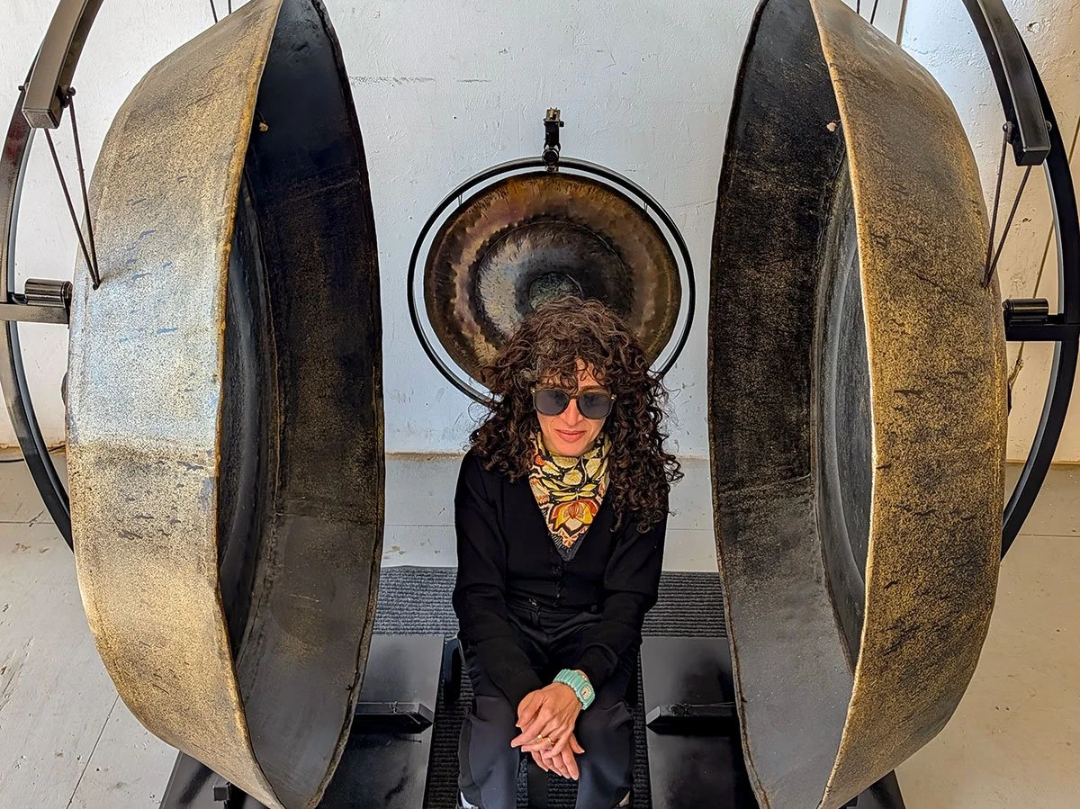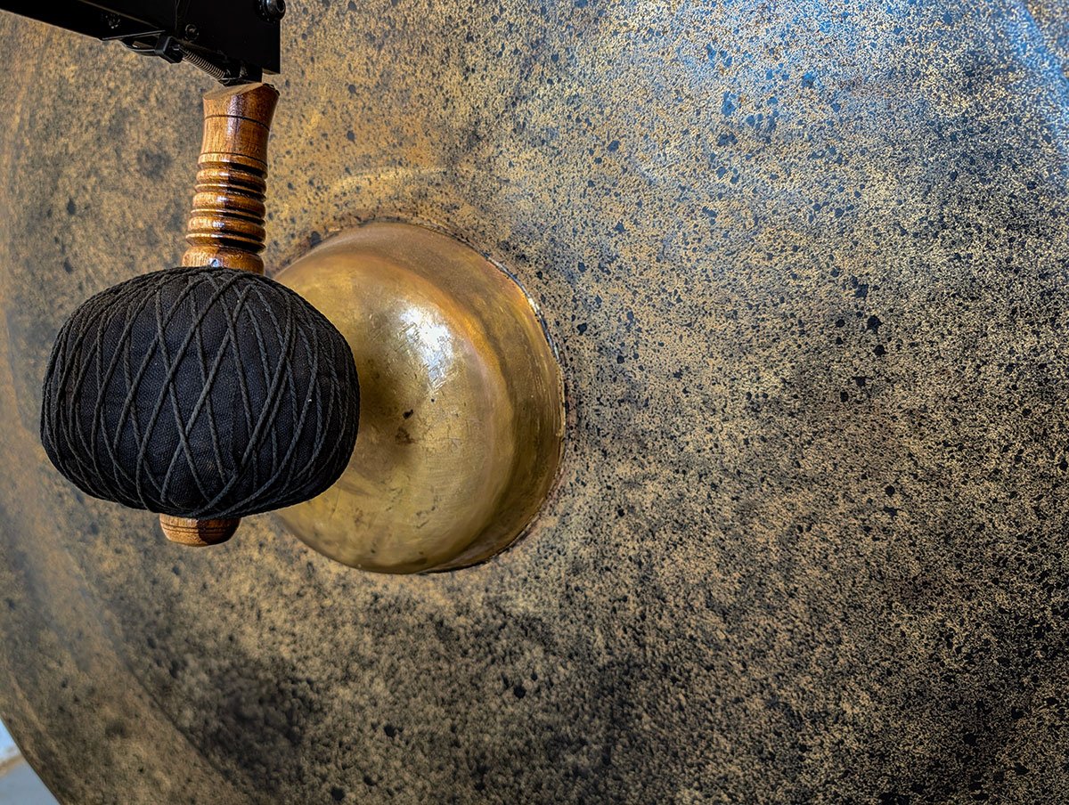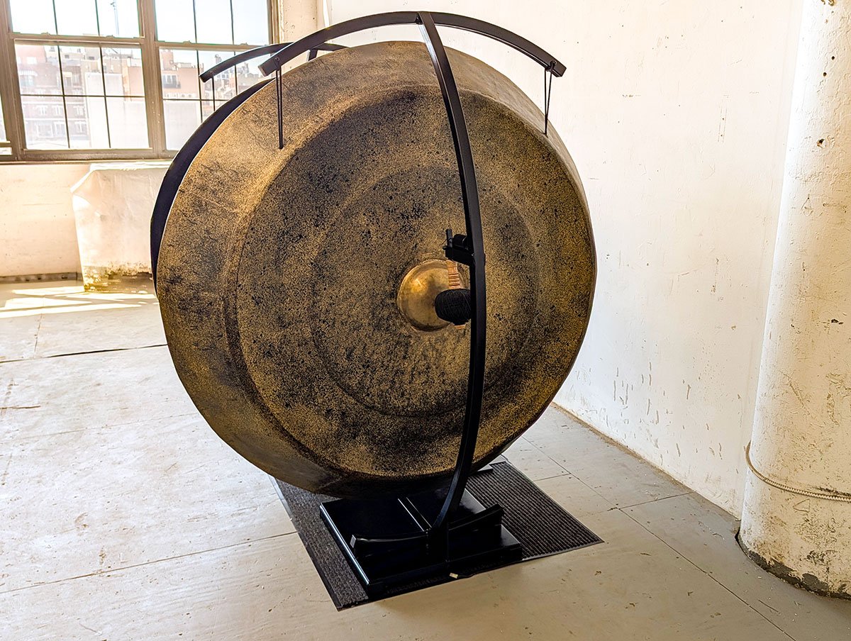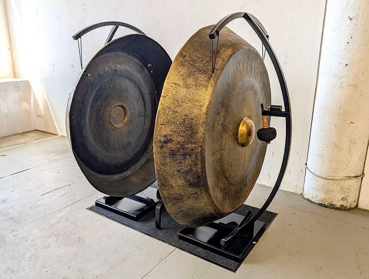 Description: BodyPhones consists of two 5ft (152cm) steel and brass gongs that resonate around 36 Hz and a 22 inch (56cm) patinated titanium gong on powder coated steel freestanding mounts with aluminum, wood, bicycle tire and fabric robotic gong mallet mechanisms connected to a physical computing system.