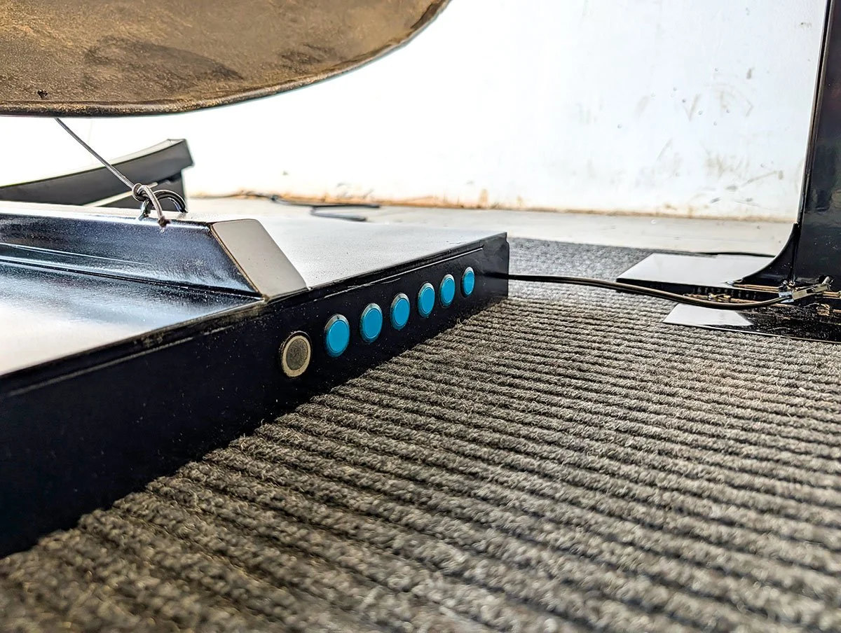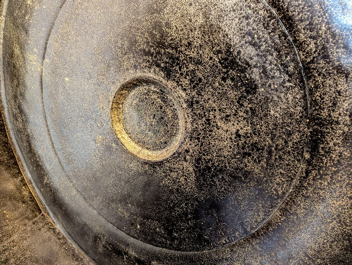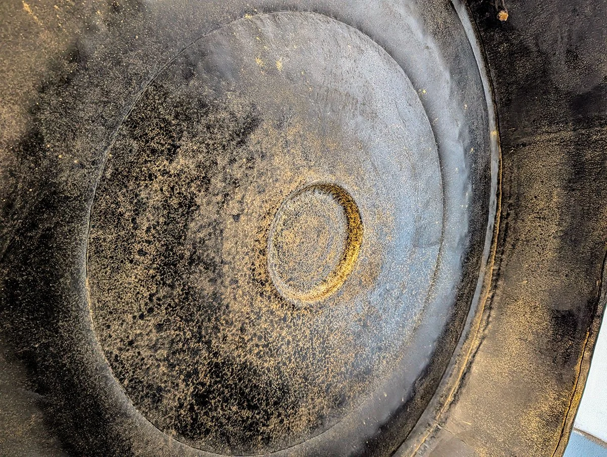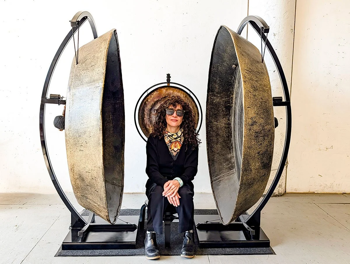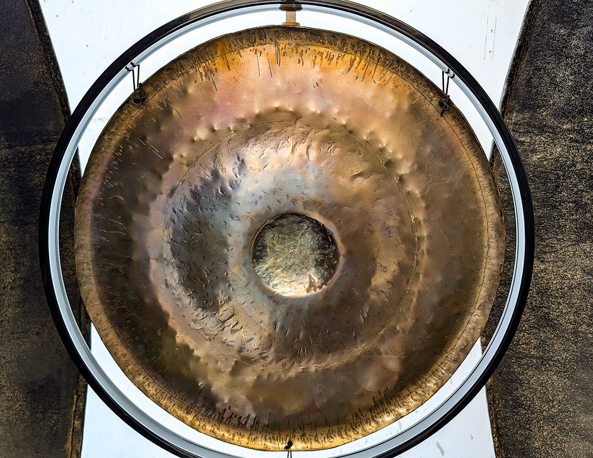 Description: BodyPhones consists of two 5ft (152cm) steel and brass gongs that resonate around 36 Hz and a 22 inch (56cm) patinated titanium gong on powder coated steel freestanding mounts with aluminum, wood, bicycle tire and fabric robotic gong mallet mechanisms connected to a physical computing system.
