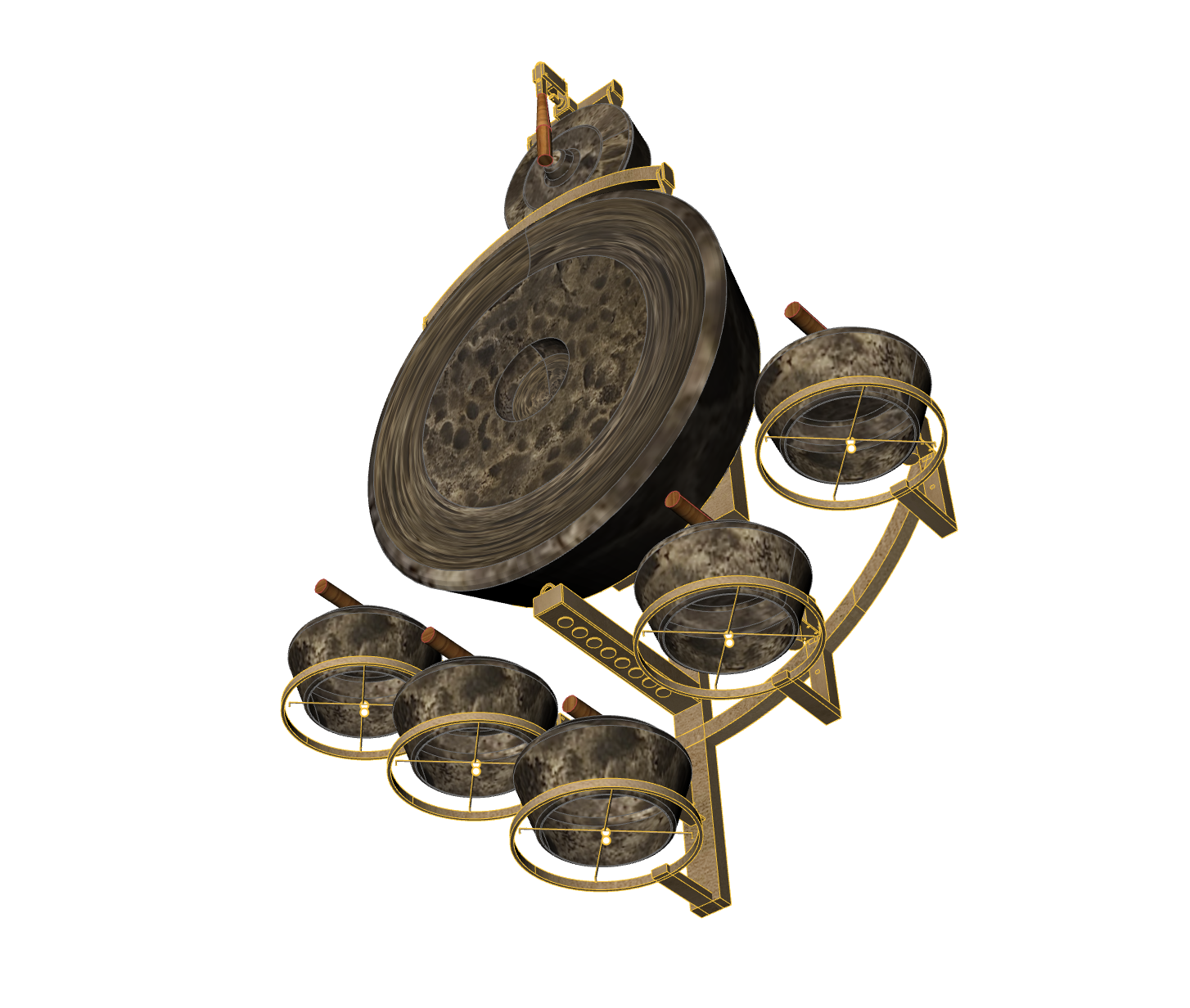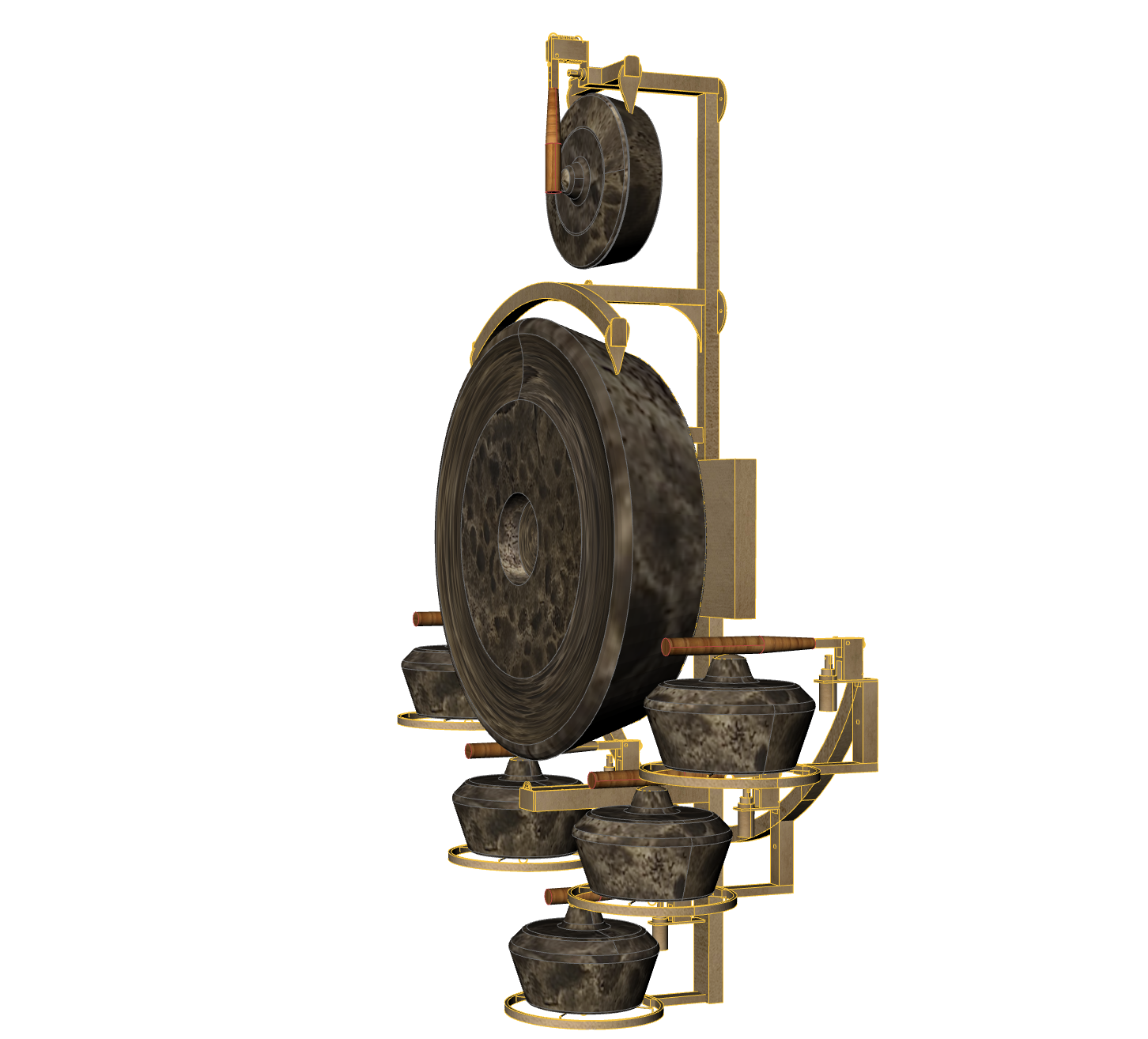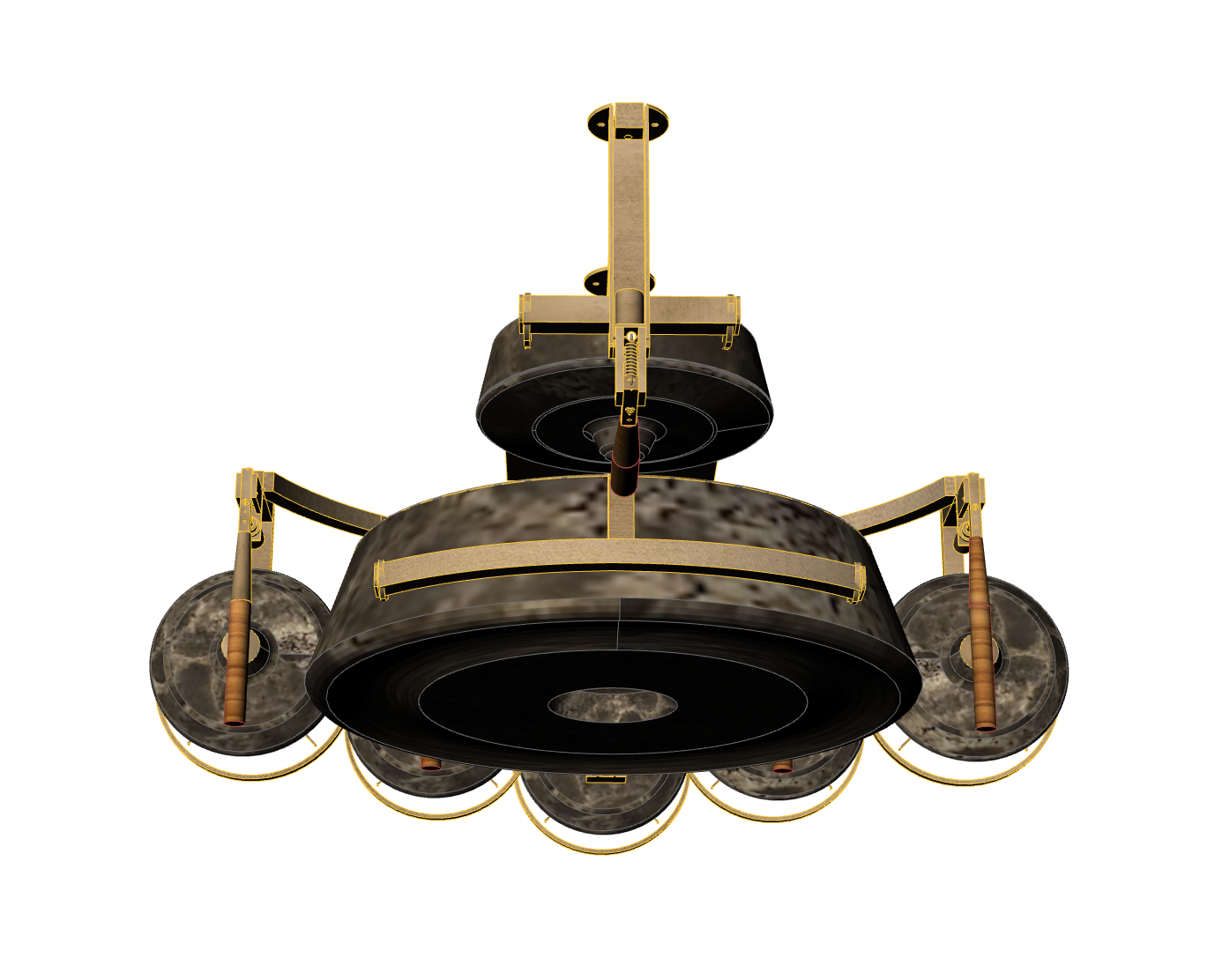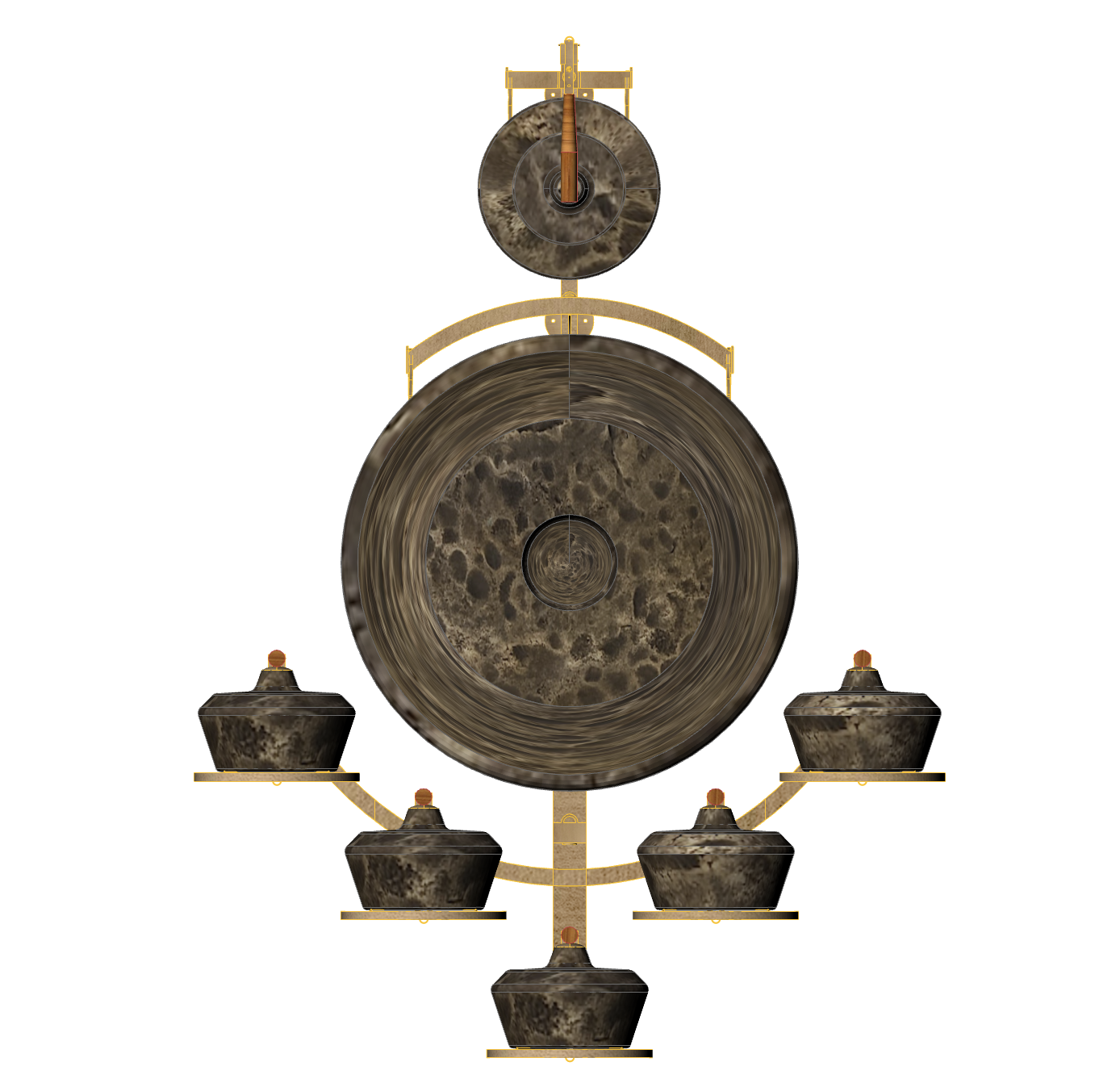 Description: Gamelatron Carbon Gold Spirit will be a sonic kinetic sculpture by Aaron Taylor Kuffner, featuring 7 hand forged bronze gongs on a gold powder stainless steel wall mounted sculpture with anodized aluminum and teak wood mechanical mallets connected to a physical computing system.
